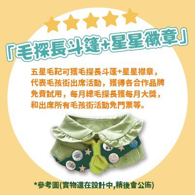 代表毛孩街出席活動各合作品牌免費試用每月總毛探長獲每月大獎出席所有毛孩街活動免門票毛探長斗蓬+星星襟章