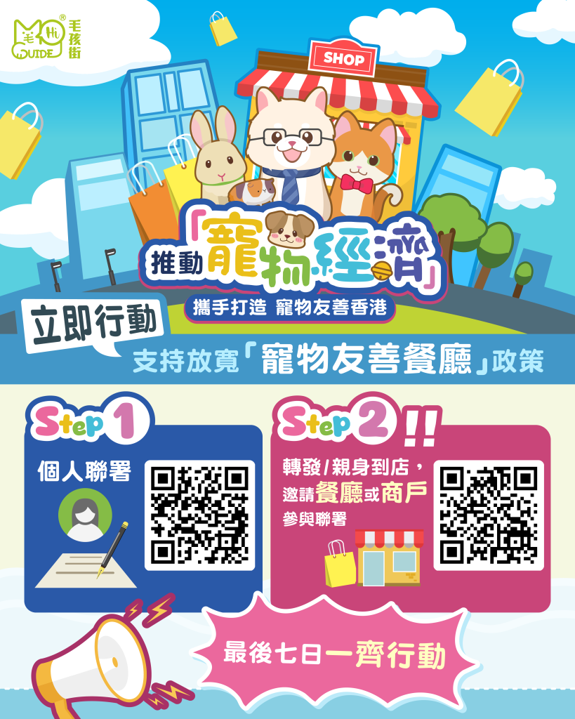 各位愛寵之人,時間進入倒數!「毛孩街」現時正聯同三位立法會議員「張欣宇」、「林素蔚」及「梁文廣」發起的聯署即將截止,現在是關鍵時刻!我們已收集數千簽名,但仍需更多餐飲業界支持,向「行政長官」提出建議,讓「寵物友善餐廳」成為香港新常態!