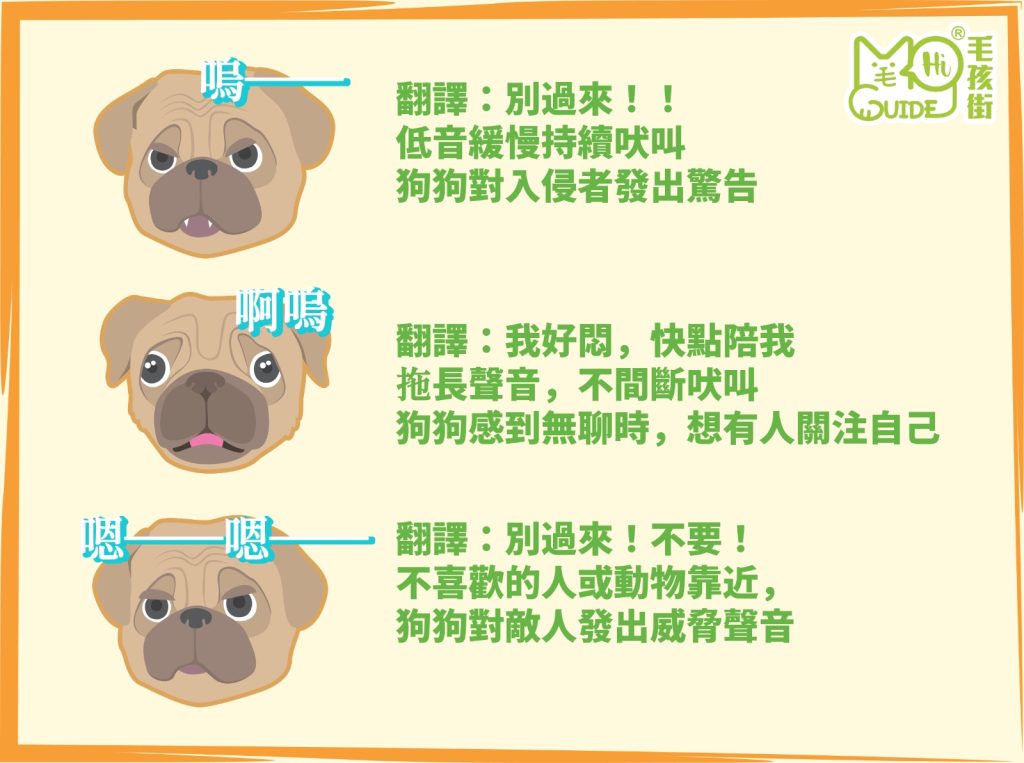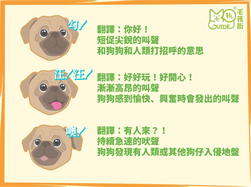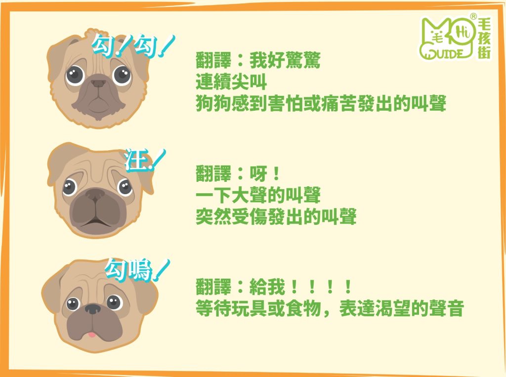【毛孩知識】狗狗🐶9種叫聲的含意❗ 毛孩知識, 資訊 / 2023-05-04 你一定要知道!勾!翻譯:你好!短促尖銳的叫聲和狗狗和人類打招呼的意思 汪!汪!翻譯:好好玩!好開心!漸漸高昂的叫聲狗狗感到愉快、興奮時會發出的叫聲 噢!翻譯:有人來?!持續急速的吠聲狗狗發現有人類或其他狗仔入侵地盤 嗚——翻譯:別過來!!低音緩慢持續吠叫狗狗對入侵者發出驚告 啊嗚翻譯:我好悶,快點陪我拖長聲音,不間斷吠叫狗狗感到無聊時,想有人關注自己 嗯——嗯——翻譯:別過來!不要!不喜歡的人或動物靠近,狗狗對敵人發出威脅聲音 勾!勾!翻譯:我好驚驚連續尖叫,狗狗感到害怕或痛苦發出的叫聲 汪!翻譯:呀!一下大聲的叫聲 (突然受傷發出的叫聲) 勾嗚!翻譯:給我!!!!等待玩具或食物,表達渴望的聲音 【毛孩知識】狗狗🐶9種叫聲的含意❗ Read More »